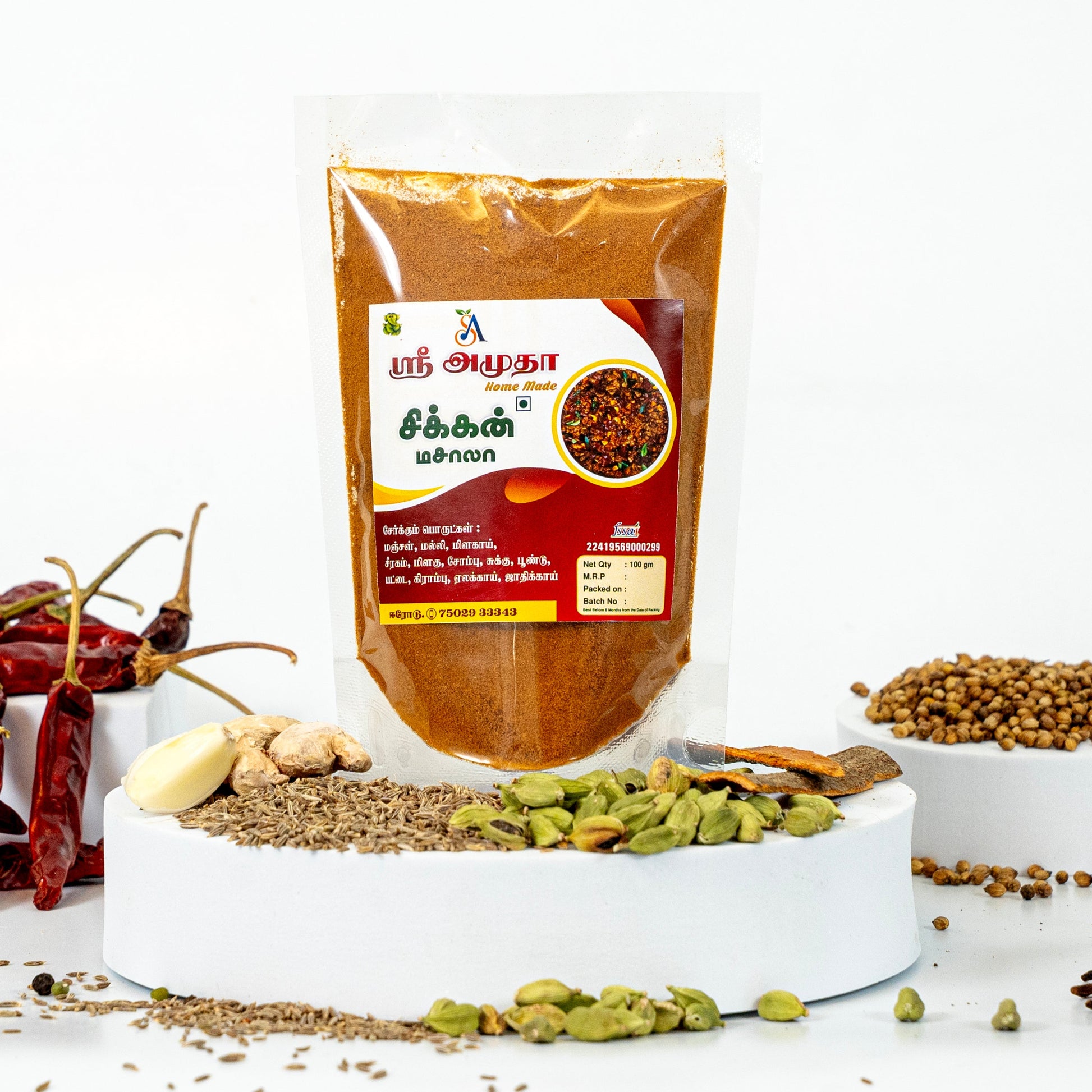 Chicken Masala – an aromatic blend of spices crafted to bring out rich, authentic flavors in every chicken dish. Perfect for curries, fries, or gravies with a bold, delicious taste.