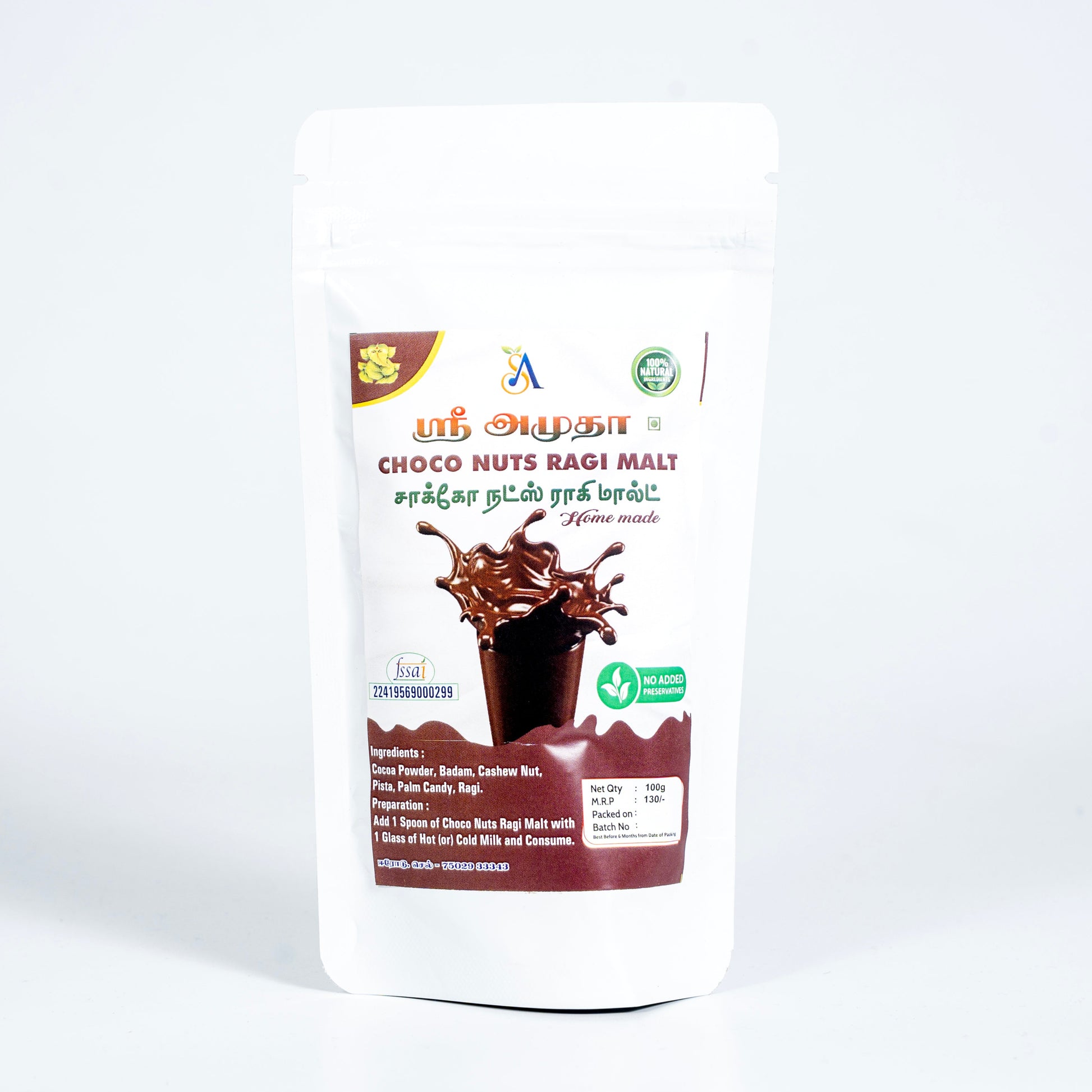 Choco Nuts Ragi Malt – a delicious health drink mix made with finger millet, cocoa, and crunchy nuts. Packed with calcium, iron, and fiber for a tasty, nutritious boost for kids and adults.